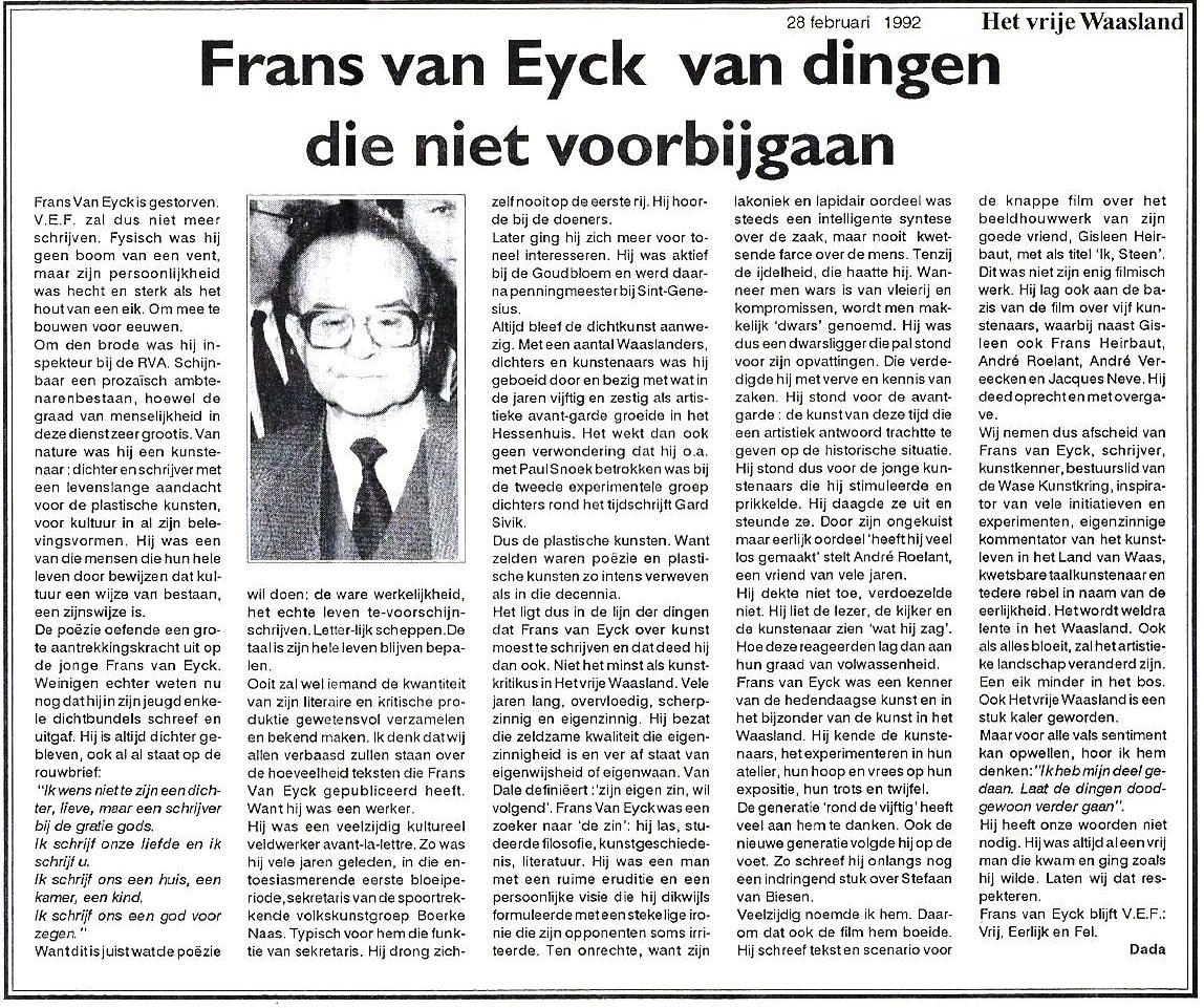 Nous disons donc au revoir à Frans van Eyck, écrivain, connaisseur en art, membre du conseil d'administration du Wase Kunstkring, inspirateur de nombreuses initiatives et expériences, commentateur volontaire de la vie artistique au Pays de Waas, artiste du langage vulnérable et tendre rebelle au nom de l'honnêteté. Ce sera bientôt le printemps dans le Waasland. Même si tout s'épanouit, le paysage artistique aura changé. Un chêne de moins dans la forêt. De même, "Het Vrije Waasland" s'est un peu dégarni.